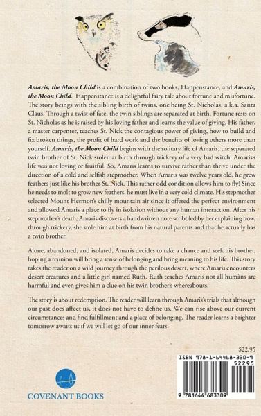 Amaris, the Moon Child is a combination of two books, Happenstance, and Amaris, the Moon Child. Happenstance is a delightful fairy tale about fortune and misfortune. The story beings with the sibling birth of twins, one being St. Nicholas, a.k.a. Santa Claus. Through a twist of fate, the twin siblings are separated at birth. Fortune rests on St. Nicholas as he is raised by his loving father and learns the value of giving. His father, a master carpenter, teaches St. Nick the contagious power of giving, how to build and fix broken things, the profit of hard work and the benefits of loving others more than yourself. Amaris, the Moon Child begins with the solitary life of Amaris, the separated twin brother of St. Nick stolen at birth through trickery of a very bad witch. Amaris's life was not loving or fruitful. So, Amaris learns to survive rather than thrive under the direction of a cold and selfish stepmother. When Amaris was twelve years old, he grew feathers just like his brother St. Nick. This rather odd condition allows him to fly! Since he needs to molt to grow new feathers, he must live in a very cold climate. His stepmother selected Mount Hermon's chilly mountain air since it offered the perfect environment and allowed Amaris a place to fly in isolation without any human interaction. After his stepmother's death, Amaris discovers a handwritten note scribbled by her explaining how, through trickery, she stole him at birth from his natural parents and that he actually has a twin brother! Alone, abandoned, and isolated, Amaris decides to take a chance and seek his brother, hoping a reunion will bring a sense of belonging and bring meaning to his life. This story takes the reader on a wild journey through the perilous desert, where Amaris encounters desert creatures and a little girl named Ruth. Ruth teaches Amaris not all humans are harmful and even gives him a clue on his twin brother's whereabouts. The story is about redemption. The reader will learn through Amaris's trials that although our past does affect us, it does not have to define us. We can rise above our current circumstances and find fulfillment and a place of belonging. The reader learns a brighter tomorrow awaits us if we will let go of our inner fears
