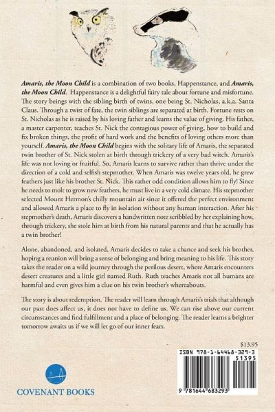 Amaris, the Moon Child is a combination of two books, Happenstance, and Amaris, the Moon Child. Happenstance is a delightful fairy tale about fortune and misfortune. The story beings with the sibling birth of twins, one being St. Nicholas, a.k.a. Santa Claus. Through a twist of fate, the twin siblings are separated at birth. Fortune rests on St. Nicholas as he is raised by his loving father and learns the value of giving. His father, a master carpenter, teaches St. Nick the contagious power of giving, how to build and fix broken things, the profit of hard work and the benefits of loving others more than yourself. Amaris, the Moon Child begins with the solitary life of Amaris, the separated twin brother of St. Nick stolen at birth through trickery of a very bad witch. Amaris's life was not loving or fruitful. So, Amaris learns to survive rather than thrive under the direction of a cold and selfish stepmother. When Amaris was twelve years old, he grew feathers just like his brother St. Nick. This rather odd condition allows him to fly! Since he needs to molt to grow new feathers, he must live in a very cold climate. His stepmother selected Mount Hermon's chilly mountain air since it offered the perfect environment and allowed Amaris a place to fly in isolation without any human interaction. After his stepmother's death, Amaris discovers a handwritten note scribbled by her explaining how, through trickery, she stole him at birth from his natural parents and that he actually has a twin brother! Alone, abandoned, and isolated, Amaris decides to take a chance and seek his brother, hoping a reunion will bring a sense of belonging and bring meaning to his life. This story takes the reader on a wild journey through the perilous desert, where Amaris encounters desert creatures and a little girl named Ruth. Ruth teaches Amaris not all humans are harmful and even gives him a clue on his twin brother's whereabouts. The story is about redemption. The reader will learn through Amaris's trials that although our past does affect us, it does not have to define us. We can rise above our current circumstances and find fulfillment and a place of belonging. The reader learns a brighter tomorrow awaits us if we will let go of our inner fears