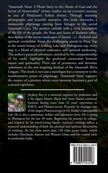 "Amarnath Yatra: A Photo Story to the Abode of God and the Secret of Immortality" invites readers on an evocative journey to one of Hinduism's holiest shrines. Through stunning photographs and heartfelt narrative, this book chronicles a memorable pilgrimage starting from Srinagar to the sacred Amarnath Cave. The journey unfolds with a vivid description of the life of the people, the flora and fauna of Kashmir valley, description of the serene landscapes of Jannat - e - Kashmir and spiritual revelations. From the challenging ascent to Pissu Top to the serene beauty of Seshnag Lake and Mahagunas top, every step is a blend of physical endurance and spiritual awakening. The author's personal adventure, enriched by the companionship of his uncle, highlights the profound connection between nature and spirituality. Their tale of persistence and devotion culminates in the awe-inspiring darshan of the Amarnath Shiva Lingam. This book is not just a travelogue but a testament to the transformative power of pilgrimage. "Amarnath Yatra" captures the essence of a journey where every moment becomes a part of a sacred experience.