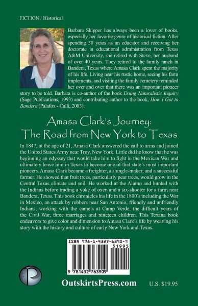 Amasa Clark's Journey: The Road from New York to Texas In 1847, at the age of 21, Amasa Clark answered the call to arms and joined the United States Army near Troy, New York. Little did he know that he was beginning an odyssey that would take him to fight in the Mexican War and ultimately leave him in Texas to become one of that state's most important pioneers. Amasa Clark became a freighter, a shingle-maker, and a successful farmer. He showed that fruit trees, particularly pear trees, would grow in the Central Texas climate and soil. He worked at the Alamo and hunted with the Indians before trading a yoke of oxen and a six-shooter for a farm near Bandera, Texas. This book chronicles his life in he 1800's including the War in Mexico, an attack by robbers near San Antonio, friendly and unfriendly Indians, working with the camels at Camp Verde, the difficult years of the Civil War, three marriages and nineteen children. This Texana book endeavors to give color and dimension to Amasa Clark's life by weaving his story with the history and culture of early New York and Texas.
