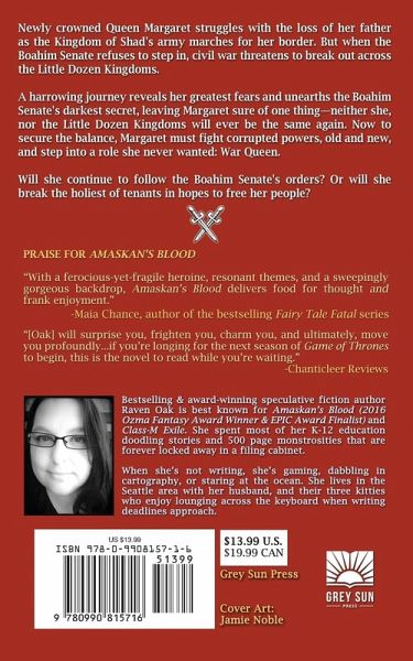 Newly crowned Queen Margaret struggles with the loss of her father as the Kingdom of Shad's army marches for her border. But when the Boahim Senate refuses to step in, civil war threatens to break out across the Little Dozen Kingdoms. A harrowing journey reveals her greatest fears and unearths the Boahim Senate's darkest secret, leaving Margaret sure of one thing-neither she, nor the Little Dozen Kingdoms will ever be the same again. Now to secure the balance, Margaret must fight corrupted powers, old and new, and step into a role she never wanted: War Queen. Will she continue to follow the Boahim Senate's orders? Or will she break the holiest of tenets in hopes to free her people?