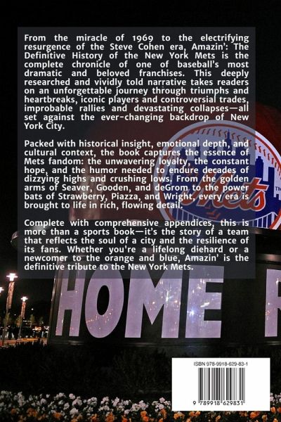 From the miracle of 1969 to the electrifying resurgence of the Steve Cohen era, Amazin': The Definitive History of the New York Mets is the complete chronicle of one of baseball's most dramatic and beloved franchises. This deeply researched and vividly told narrative takes readers on an unforgettable journey through triumphs and heartbreaks, iconic players and controversial trades, improbable rallies and devastating collapses-all set against the ever-changing backdrop of New York City. Packed with historical insight, emotional depth, and cultural context, the book captures the essence of Mets fandom: the unwavering loyalty, the constant hope, and the humor needed to endure decades of dizzying highs and crushing lows. From the golden arms of Seaver, Gooden, and deGrom to the power bats of Strawberry, Piazza, and Wright, every era is brought to life in rich, flowing detail. Complete with comprehensive appendices, this is more than a sports book-it's the story of a team that reflects the soul of a city and the resilience of its fans. Whether you're a lifelong diehard or a newcomer to the orange and blue, Amazin' is the definitive tribute to the New York Mets.