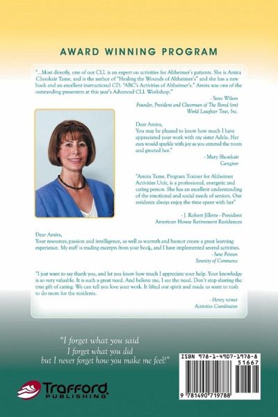 Hopefully, this book provides you with a systematic approach to reduce the emotional, functional and environmental effects of Alzheimer's disease through the use of these therapeutic activities and creative techniques. The strongest emotional healers of wounds created by Alzheimer's disease are love, care and respect. Alzheimer's was not brought on by anything you or your loved ones did or didn't do. So, be easy on the person you are caring for and especially easy on yourself as you embark on this difficult journey.