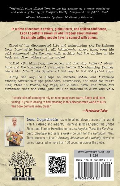 Aired in 100 countries. Tired of his disconnected life and uninspiring job, Leon Logothetis leaves it all behind-job, money, home, even his cell phone-and hits the road with nothing but the clothes on his back and five dollars in his pocket, relying on the kindness of strangers and the serendipity of the open road for his daily keep. Along the way, Leon offers up the intriguing and charming tales gathered along his one-of-a-kind journey riding in trains and buses and big rigs and classic cars; sleeping on streets and couches and firehouses; meeting pimps and preachers, astronauts and single moms, celebrities and homeless families, veterans and communists. Each day of his journey, we catch sight of the invisible spiritual underpinning of society in these stories of companionship-and sheer adventure-that prove that the kind, good soul of mankind has not been lost.