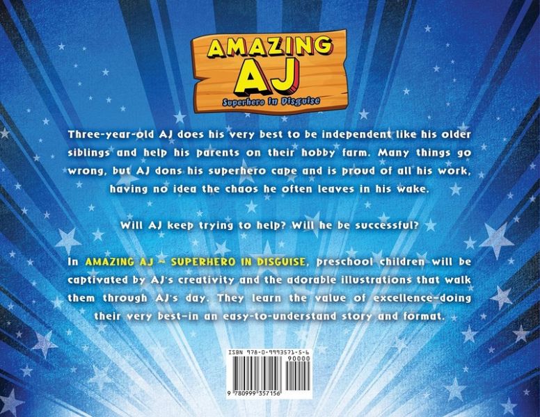Three-year-old AJ does his very best to be independent like his older siblings and help his parents on their hobby farm. Many things go wrong, but AJ dons his superhero cape and is proud of all his work, having no idea the chaos he often leaves in his wake. Will AJ keep trying to help? Will he be successful? In Amazing AJ Superhero in Disguise, preschool children will be captivated by AJ's creativity and the adorable illustrations that walk them through AJ's day. They learn the value of excellence-doing their very best-in an easy-to-understand story and format.