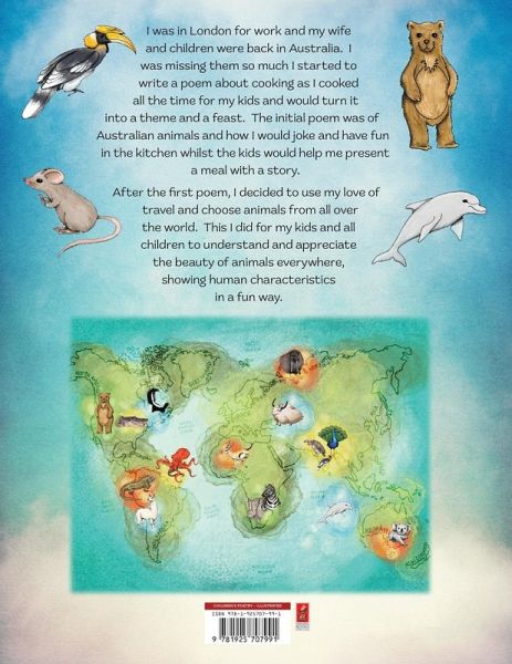 I was in London for work and my wife and children were back in Australia. I was missing them so much I started to write a poem about cooking as I cooked all the time for my kids and would turn it into a theme and a feast. The initial poem was of Australian animals and how I would joke and have fun in the kitchen whilst the kids would help me present a meal with a story. After the first poem, I decided to use my love of travel and choose animals from all over the world. This I did for my kids and all children to understand and appreciate the beauty of animals everywhere, showing human characteristics in a fun way.
