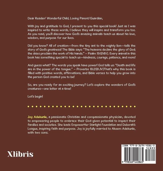 Dear Reader/ Wonderful Child, Loving Parent/Guardian, With joy and gratitude to God, I present to you this special book! Just as I was inspired to write these words, I believe they will inspire and transform you too. As you read, you'll discover how God's amazing animals teach us about his love, wisdom, and purpose for our lives. Did you know? All of creation-from the tiny ant to the mighty lion-tells the story of God's greatness! The Bible says: "The heavens declare the glory of God; the skies proclaim the work of His hands." - Psalm 19:1(NIV). Every animal in this book has something special to teach us-kindness, courage, patience, and more! And guess what? The words you speak have power! God tells us: "Death and life are in the power of the tongue." - Proverbs 18:21(KJV)That's why this book is filled with positive words, affirmations, and Bible verses to help you grow into the person God created you to be! So, are you ready for an exciting journey? Let's explore the wonders of God's creatures-one letter at a time! Let's begin!