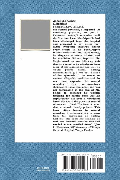 The scripture says in Ezekiel 47:12 "...Trees will provide food, and their leaves will be used for healing." This book describes plants in the bible, their medicinal properties and uses. It also gives a listing of many mouthwatering culinary and health restorative recipes...."This book offers lessons in natural remedies. But in the person of Mr. K Scipio we have a teacher for our Spirits. I am very lucky to have had the opportunity to learn from such a person. I encourage you to learn from his knowledge of healing herbs, but also from the example of faith and kindness traits so rare and needed in our troubled times." Jon L. Hemstreet, MD formerly of Tampa General Hospital Family Center, Tampa,Florida.