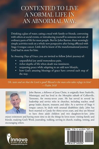 -ABOUT THE BOOK: Drinking a glass of water, eating a meal with family or friends, conversing with others at social events, or introducing yourself to someone new are all ordinary parts of life for most people. But for John Barton, these seemingly simple activities took on a whole new perspective after being afflicted with Stage 4 tongue cancer. Little did he know of the transformational journey God had in store for him. In Amazing Days of Grace, you are invited to follow John's journey of, unparalleled joy amid tremendous pain, richer depths of life when death was imminent, surpassing peace while adapting to an odd new lifestyle, and how God's amazing blessings of grace have covered each step of the way. -ABOUT THE AUTHOR: John Barton, a follower of Jesus Christ, is originally from Starkville, Mississippi, and has lived in the Memphis suburb of Collierville, Tennessee, for twenty-seven years. He has served in several lay leadership and service roles in churches, including teacher, small group leader, deacon, treasurer, and elder. As a survivor of stage four tongue cancer, he deals with unusual disabilities daily. John has been married to Candy for thirty-seven years, and they are blessed to have three adult children and two daughters-in-law. John enjoys retirement and having more time to do the things he loves most: visiting family and friends, studying God's Word, journaling, walking, serving in church, reading, writing, and encouraging others. ¿¿¿¿¿¿-ABOUT THE PUBLISHER: ¿Innovo Publishing LLC a multimedia publisher located near Memphis, TN. Since 2008, Innovo has published quality books, eBooks, audiobooks, music, screenplays, and curricula for authors, artists, and organizations within Christian and wholesome markets. Innovo's capabilities and global reach provide authors, artists and ministries access to the world for Christ. To learn more about Innovo Publishing, visit our website at innovopublishing.com. To connect with other Christian creatives and to learn best practices for creating, publishing, marketing, and selling Christian titles, visit the Christian Publishing Portal at cpportal.com.