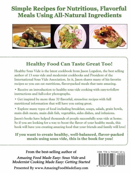 Are you looking for hearty, flavorful meals that won't make you feel bloated afterwards? Then you are in luck! Healthy Sous Vide is the latest cookbook from Jason Logsdon, the best selling author of 10 sous vide and modernist cookbooks, and it shares many of his favorite recipes developed over the years so you can eat nutritious, flavor-packed meals that taste amazing. In This Book You Will Discover An introduction to healthy sous vide cooking with easy-to-follow instructions and tons of photographs. The hardcover version is in full color while the less-expensive paperback is in black and white. More than 70 flavorful, stress-free recipes with full nutritional information that will have you eating great and amazing your friends and family. A sampling of which include: High energy breakfast foods: Egg Cup Bites, Cinnamon Raisin Oatmeal, Blueberry Compote, Sous Vide Yogurt, Avocado Toast with Hard Boiled Egg, and Shakshuka with Egg Blossoms Many savory soups: Hot and Sour Chicken, Curried Butternut Squash, Creamy Parsnip, Tortilla Soup Filling salads: Cod with Watermelon and Cucumber, Duck with Cherry Vinaigrette, Tuna and Ginger, Turkey and Avocado, and Peach and Blue Cheese Nutritious grain bowls: Chicken and Avocado, Harissa-Marinated Tofu, Cuban Style Beef, Tuna Poke, Garlic Lamb, Halibut with Melon A dozen main dish meats: Chicken Mole, Hanger Steak Succotash, Moroccan Tajine, Filet Mignon with Brussels Sprouts, and Strip Steak with Cauliflower Puree Flavorful fish dishes: Sea Bass with Mango Salsa, Squid Puttanesca with Zucchini Noodles, Swordfish with Romesco Sauce, Citrus Cured Salmon, Scallops with Tabbouleh Filling sides: Spicy Street Corn, Dill Pickles, Miso Glazed Turnips, Sesame Bok Choy, Southwestern Sweet Potato Salad and Spicy Pickled Carrots Flavorful infusions: Orange Fennel Vinegar, Lemon Tarragon Olive Oil and even sugar-free soda mixers like Root Beer and Cherry Vanilla A general introduction to sous vide cooking. A look at the equipment you will need for cooking sous vide: from a simple no-cost method that will allow you to give sous vide cooking a try, to a low-cost setup that will meet all of your sous vide cooking needs. Comprehensive sous vide time and temperature charts, as well as cooking-by-thickness times, allowing you to convert all your favorite healthy recipes to sous vide. And much, much more! Jason's books have helped tens of thousands of people learn how to successfully sous vide at home, so if you are a looking for a way to boost the flavor of your healthy meals, this book will help you create amazing food that your friends and family will love! What People Are Saying "Delicious. I can see using that charmoula on any number of proteins. I like that it is not overly processed." - Tracye "Can I buy an autographed copy...your methods made me appear like a pro!" - Cory "Stop it Jason! This soup is perfect for a cold winters night dinner comfort food at its best. A good wine and some hearty bread to go with that bowl of happiness I hope." - Laura "Beautiful pictures, beautiful food!" - Michele To be clear, this is not a "diet" book, and doesn't espouse any specific dietary guidelines. It is focused on using all-natural foods to create flavor-packed meals that will look and taste great. If you have specific dietary needs, you can pick and choose the recipes that work for you, or use the recipes to find inspiration to create recipes of your own. If you want to use sous vide to prepare nutritious and flavorful food then this is the book for you!