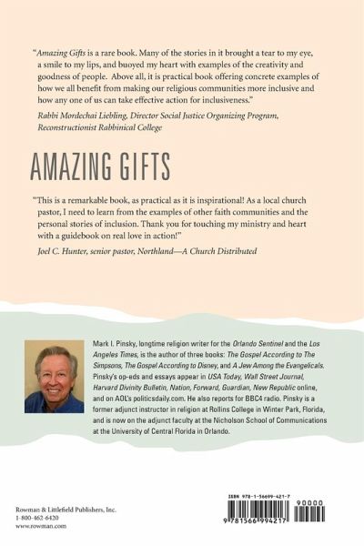Amazing Gifts: Stories of Faith, Disability, and Inclusion is a new publication by noted religion writer Mark I. Pinsky. Pinsky has gathered stories from churches, synagogues, mosques, and temples across the country, "stories of people with disabilities and the congregations where they have found welcome." He has taken special care to include the widest range of disabilities, including non-apparent disabilities like lupus, chronic pain, traumatic brain injury, depression, and mental illness. There were 54 million American with disabilities as of 2000, and that number is now being swelled by wounded warriors from the Afghan and Iraq wars and an aging population. he author emphasizes that his purpose is to not to write a resource manual on accessibility and inclusion. Rather, Pinsky seeks to share stories of how people with disabilities have experienced their faith in the context of their disability, and how congregations have gained when they value the gifts that people with disabilities bring along. "This book," notes the author, "is for congregational leaders and others who may have no expertise or personal experience with disability, but who make the congregational decisions about accessibility and inclusion."