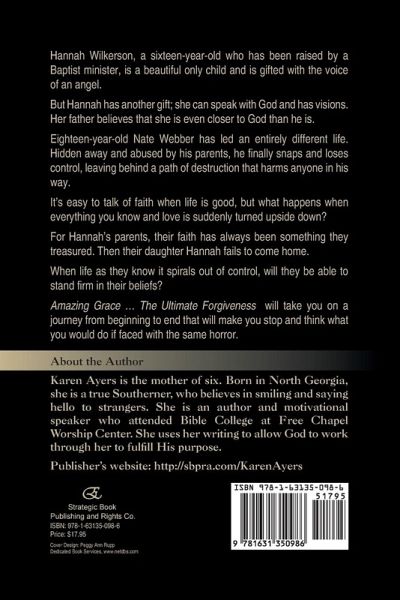 Hannah Wilkerson, a sixteen-year-old who has been raised by a Baptist minister, is a beautiful only child and is gifted with the voice of an angel. But Hannah has another gift; she can speak with God and has visions. Her father believes that she is even closer to God than he is. Eighteen-year-old Nate Webber has led an entirely different life. Hidden away and abused by his parents, he finally snaps and loses control, leaving behind a path of destruction that harms anyone in his way. It's easy to talk of faith when life is good, but what happens when everything you know and love is suddenly turned upside down? For Hannah's parents, their faith has always been something they treasured. Then their daughter Hannah fails to come home. When life as they know it spirals out of control, will they be able to stand firm in their beliefs? Amazing Grace ... The Ultimate Forgiveness will take you on a journey from beginning to end that will make you stop and think what you would do if faced with the same horror. About the Author Karen Ayers is the mother of six. Born in North Georgia, she is a true Southerner, who believes in smiling and saying hello to strangers. She is an author and motivational speaker who attended Bible College at Free Chapel Worship Center. She uses her writing to allow God to work through her to fulfill His purpose. Publisher's website: http://sbpra.com/KarenAyers