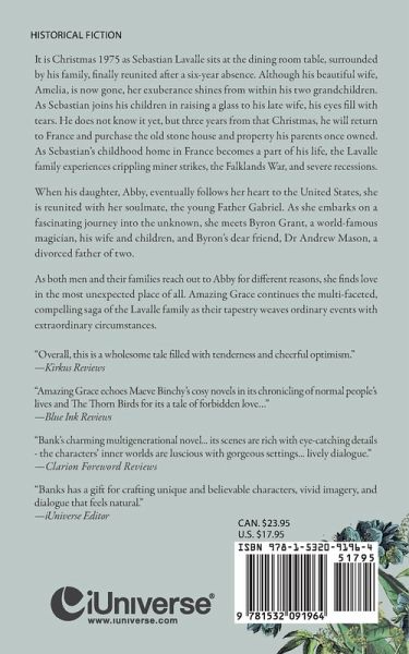 It is Christmas 1975 as Sebastian Lavalle sits at the dining room table, surrounded by his family, finally reunited after a six-year absence. Although his beautiful wife, Amelia, is now gone, her exuberance shines from within his two grandchildren. As Sebastian joins his children in raising a glass to his late wife, his eyes fill with tears. He does not know it yet, but three years from that Christmas, he will return to France and purchase the old stone house and property his parents once owned. As Sebastian's childhood home in France becomes a part of his life, the Lavalle family experiences crippling miner strikes, the Falklands War, and severe recessions. When his daughter, Abby, eventually follows her heart to the United States, she is reunited with her soulmate, the young Father Gabriel. As she embarks on a fascinating journey into the unknown, she meets Byron Grant, a world-famous magician, his wife and children, and Byron's dear friend, Dr Andrew Mason, a divorced father of two. As both men and their families reach out to Abby for different reasons, she finds love in the most unexpected place of all. Amazing Grace continues the multi-faceted, compelling saga of the Lavalle family as their tapestry weaves ordinary events with extraordinary circumstances.