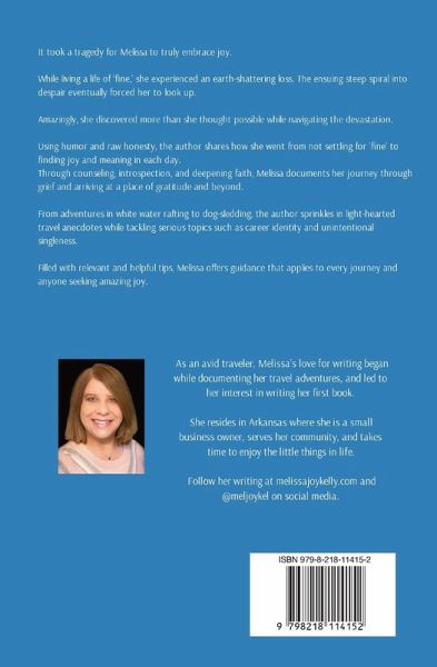 It took a tragedy for Melissa to truly embrace joy. While living a life of 'fine,' she experienced an earth-shattering loss. The ensuing steep spiral into despair eventually forced her to look up. Amazingly, she discovered more than she thought possible while navigating the devastation. Using humor and raw honesty, the author shares how she went from not settling for 'fine' to finding joy and meaning in each day. Through counseling, introspection, and deepening faith, Melissa documents her journey through grief and arriving at a place of gratitude and beyond. From adventures in white water rafting to dog-sledding, the author sprinkles in light-hearted travel anecdotes while tackling serious topics such as career identity and unintentional singleness. Filled with relevant and helpful tips, Melissa offers guidance that applies to every journey and anyone seeking amazing joy. relevant and helpful tips, Melissa offers guidance that applies to every journey and anyone seeking amazing joy.