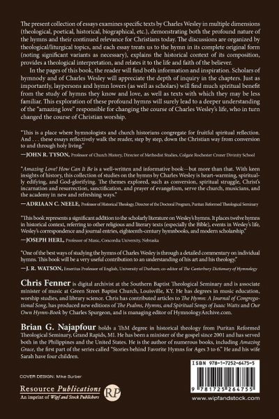 The present collection of essays examines specific texts by Charles Wesley in multiple dimensions (theological, poetical, historical, biographical, etc.), demonstrating both the profound nature of the hymns and their continued relevance for Christians today. The discussions are organized by theological/liturgical topics, and each essay treats us to the hymn in its complete original form (noting significant variants as necessary), explains the historical context of its composition, provides a theological interpretation, and relates it to the life and faith of the believer. In the pages of this book, the reader will find both information and inspiration. Scholars of hymnody and of Charles Wesley will appreciate the depth of inquiry in the chapters. Just as importantly, laypersons and hymn lovers (as well as scholars) will find much spiritual benefit from the study of hymns they know and love, as well as texts with which they may be less familiar. This exploration of these profound hymns will surely lead to a deeper understanding of the ""amazing love"" responsible for changing the course of Charles Wesley's life, who in turn changed the course of Christian worship. With contributions from: Steve Weaver Jonathan A. Powers Patrick A. Eby Christopher P. McFadden C. Michael Hawn Josh Dear Joe Harrod Paul W. Chilcote Roger D. Duke Michael A.G. Haykin Margaret Garrett Jim Scott Orrick