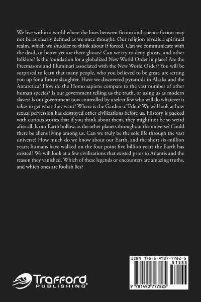 We live within a world where the lines between fiction and science fiction may not be as clearly defined as we once thought. Our religion reveals a spiritual realm, which we shudder to think about if forced. Can we communicate with the dead, or better yet are there ghosts? Can we try to deny ghosts, and other folklore? Is the foundation for a globalized New World Order in place? Are the Freemasons and Illuminati associated with the New World Order? You will be surprised to learn that many people, who you believed to be great, are setting you up for a future slaughter. Have we discovered pyramids in Alaska and the Antarctica? How do the Homo sapiens compare to the vast number of other human species? Is our government telling us the truth, or using us as modern slaves? Is our government now controlled by a select few who will do whatever it takes to get what they want? Where is the Garden of Eden? We will look at how sexual perversion has destroyed other civilizations before us. History is packed with curious stories that if you think about them, they might not be so weird after all. Is our Earth hollow, as the other planets throughout the universe? Could there be aliens living among us. Can we truly be the sole life through the vast universe? How much do we know about our Earth, and the short six-million years; humans have walked on the four point five billion years the Earth has existed? We will look at a few civilizations that existed prior to Atlantis and the reason they vanished. Which of these legends or encounters are amazing truths, and which ones are foolish lies?