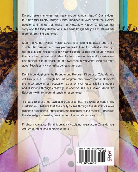 Do you have memories that make you Amazingly Happy? Ciana does. In Amazingly Happy Things, Ciana imagines in vivid detail the events, people, and things that make her Amazingly Happy. Check out her story and the lively illustrations, see what brings her joy and makes her grateful- both big and small. Meet the Author: Nicole Peltier Lewis is a lifelong educator and a life coach. Her passion is to see people reach their full potential. Through her books, she hopes to teach young people to see the value in those things in life that are invaluable like family, memories and experiences. She resides with her husband and two sons in Maryland. Find out more about Nicole at www.onesharpensanother.com Dominique Hughes Is the Founder and Program Director of Zola Monroe Art Group, LLC. Through her art program she proves and implements the importance of art education as a form of responsibility, structure and discipline through creativity. In addition she is a Mixed Media Art Educator with 10 years of teaching experience. “I create to share the awe and tranquility that I’ve experienced, in my illustrations. I believe that the ability to see through the illustrators eyes expands experience, knowledge and cognition of the reader. It changes the stereotypical reading environment to one of discovery”. Find out more about Dominique at www.zolamonroeart.com, Zola Monroe Art Group on all social media outlets.