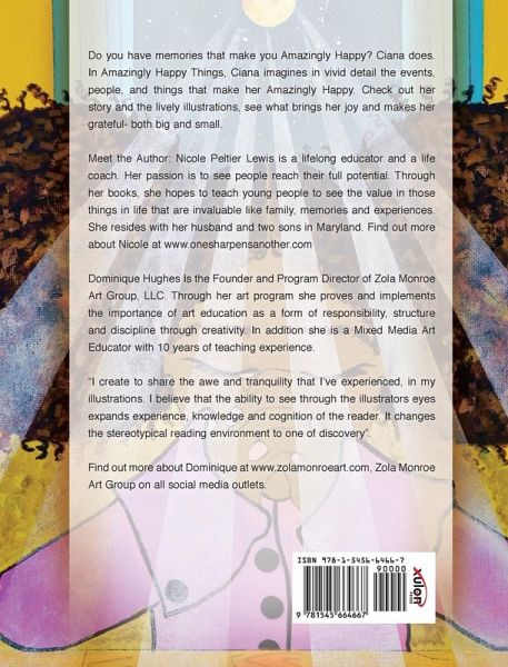 Do you have memories that make you Amazingly Happy? Ciana does. In Amazingly Happy Things, Ciana imagines in vivid detail the events, people, and things that make her Amazingly Happy. Check out her story and the lively illustrations, see what brings her joy and makes her grateful- both big and small. Meet the Author: Nicole Peltier Lewis is a lifelong educator and a life coach. Her passion is to see people reach their full potential. Through her books, she hopes to teach young people to see the value in those things in life that are invaluable like family, memories and experiences. She resides with her husband and two sons in Maryland. Find out more about Nicole at www.onesharpensanother.com Dominique Hughes Is the Founder and Program Director of Zola Monroe Art Group, LLC. Through her art program she proves and implements the importance of art education as a form of responsibility, structure and discipline through creativity. In addition she is a Mixed Media Art Educator with 10 years of teaching experience. “I create to share the awe and tranquility that I’ve experienced, in my illustrations. I believe that the ability to see through the illustrators eyes expands experience, knowledge and cognition of the reader. It changes the stereotypical reading environment to one of discovery”. Find out more about Dominique at www.zolamonroeart.com, Zola Monroe Art Group on all social media outlets.
