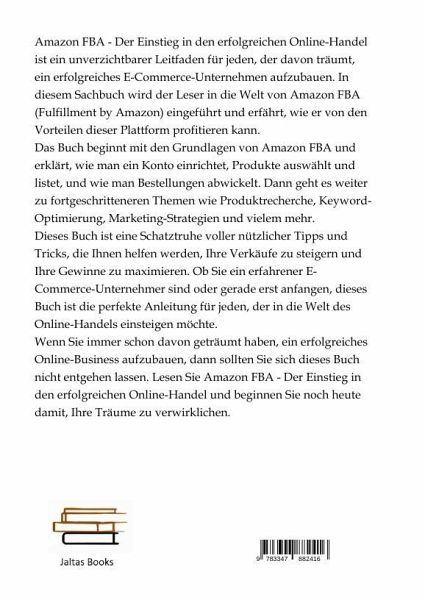 Amazon FBA - Der Einstieg in den erfolgreichen Online-Handel ist ein unverzichtbarer Leitfaden für jeden, der davon träumt, ein erfolgreiches E-Commerce-Unternehmen aufzubauen. In diesem Sachbuch wird der Leser in die Welt von Amazon FBA (Fulfillment by Amazon) eingeführt und erfährt, wie er von den Vorteilen dieser Plattform profitieren kann.Das Buch beginnt mit den Grundlagen von Amazon FBA und erklärt, wie man ein Konto einrichtet, Produkte auswählt und listet, und wie man Bestellungen abwickelt. Dann geht es weiter zu fortgeschritteneren Themen wie Produktrecherche, Keyword-Optimierung, Marketing-Strategien und vielem mehr.Dieses Buch ist eine Schatztruhe voller nützlicher Tipps und Tricks, die Ihnen helfen werden, Ihre Verkäufe zu steigern und Ihre Gewinne zu maximieren. Ob Sie ein erfahrener E-Commerce-Unternehmer sind oder gerade erst anfangen, dieses Buch ist die perfekte Anleitung für jeden, der in die Welt des Online-Handels einsteigen möchte.Wenn Sie immer schon davon geträumt haben, ein erfolgreiches Online-Business aufzubauen, dann sollten Sie sich dieses Buch nicht entgehen lassen. Lesen Sie Amazon FBA - Der Einstieg in den erfolgreichen Online-Handel und beginnen Sie noch heute damit, Ihre Träume zu verwirklichen.