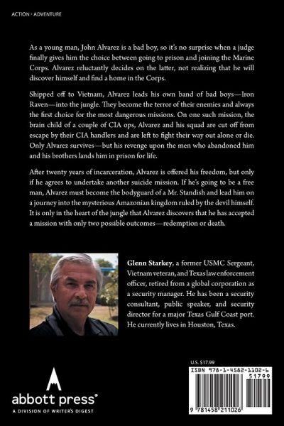 As a young man, John Alvarez is a bad boy, so it's no surprise when a judge finally gives him the choice between going to prison and joining the Marine Corps. Alvarez reluctantly decides on the latter, not realizing that he will discover himself and find a home in the Corps. Shipped off to Vietnam, Alvarez leads his own band of bad boys-Iron Raven-into the jungle. They become the terror of their enemies and always the first choice for the most dangerous missions. On one such mission, the brain child of a couple of CIA ops, Alvarez and his squad are cut off from escape by their CIA handlers and are left to fight their way out alone or die. Only Alvarez survives-but his revenge upon the men who abandoned him and his brothers lands him in prison for life. After twenty years of incarceration, Alvarez is offered his freedom, but only if he agrees to undertake another suicide mission. If he's going to be a free man, Alvarez must become the bodyguard of a Mr. Standish and lead him on a journey into the mysterious Amazonian kingdom ruled by the devil himself. It is only in the heart of the jungle that Alvarez discovers that he has accepted a mission with only two possible outcomes-redemption or death.
