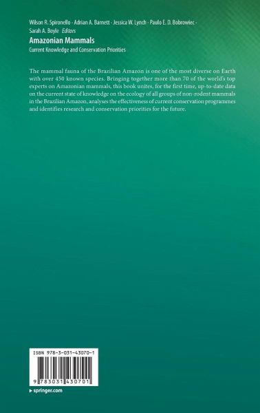 Why This Book on Amazonian Mammals Is Needed.- Xenarthrans of Brazilian Amazon: Recent Discoveries, Knowledge Gaps, and Conservation Concerns.- Biodiversity and Conservation of Bats in the Brazilian Amazonia - With a Review of the Last 10 Years of Research.- Primates of Brazilian Amazonia: Knowledge, Research Gaps and Conservation Priorities.- Claws and Fangs: Carnivore Abundance and the Conservation Importance of Amazonia.- Mammalian Megafauna: A Cross-continental Comparison in Research Output.- Amazonian Aquatic Mammals: Existing Knowledge, Current Threats and Future Studies.- Historical Commercial Hunting of Mammals in Amazonia.- Subsistence Hunting and Wild Meat Trade.- Management of Subsistence Hunting of Mammals in Amazonia: A Case Study in Loreto, Peru.- Showing and Saving: The Challenges and Opportunities of Mammal-based Tourism in Brazilian Amazonia.- Large-scale Land-use Changes and the Amazonian Mammal Biota.- Habitat Fragmentation Impacts on Amazonian Non-volant Mammals.- Bat Responses to Anthropogenic Forest Fragmentation: Insights from an Amazonian Fragmentation Experiment in Brazil.- Infectious Diseases: A Threat to the Conservation of Amazonian Mammal Species.- Mining Impacts on Aquatic Mammals of the Brazilian Amazon.- Chapter Effects of Anthropogenic Climate Change on Ecosystems and Biodiversity, Especially on Amazonian Mammals.- Conservation Strategies for Mammals in Brazilian Amazonia: Future Studies at Local, Regional and Global Scales.