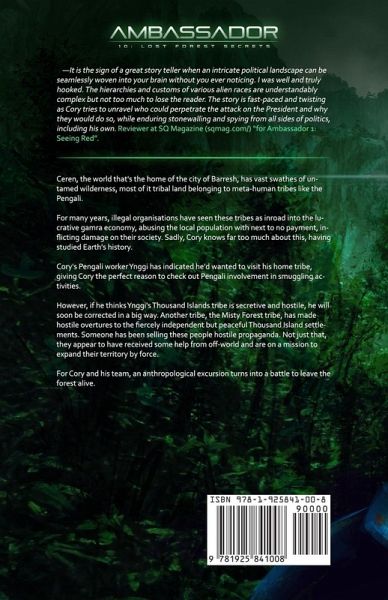 The latest book in the long-running Ambassador series Ceren, the world that's the home of the city of Barresh, has vast swathes of untamed wilderness, most of it tribal land belonging to the meta-human tribes like the Pengali. For many years, illegal organisations have seen these tribes as inroads into the lucrative gamra economy, abusing the local population with next to no payment, inflicting damage on their society. Sadly, Cory knows far too much about this, having studied Earth's history. Cory's Pengali worker Ynggi has indicated he'd wanted to visit his home tribe, giving Cory the perfect reason to check out Pengali involvement in smuggling activities. However, if he thinks Ynggi's Thousand Island tribe is secretive and hostile, he will soon be corrected in a big way. Another tribe, the Misty Forest tribe, has made hostile overtures to the fiercely independent but peaceful Thousand Island settlements. Someone has been selling these people hostile propaganda. Not just that, they appear to have received some help from off-world and are on a mission to expand their territory by force. For Cory and his team, an anthropological excursion turns into a battle to leave the forest alive.