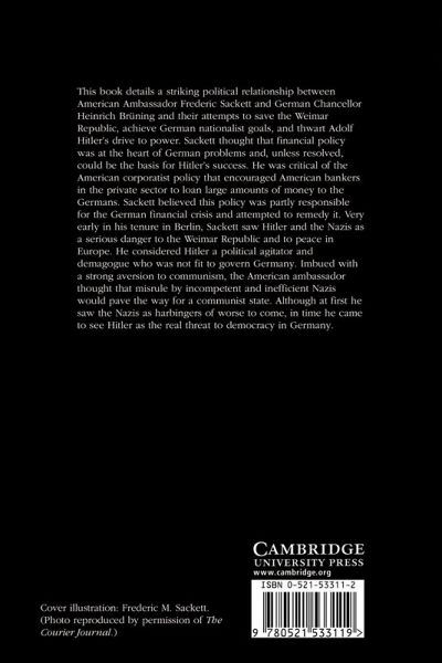 This book details a striking political relationship between American Ambassador Frederic Sackett and German Chancellor Heinrich Brüning and their attempts to save the Weimar Republic, achieve German nationalist goals, and thwart Adolf Hitler's drive to power. Sackett believed that financial policy was at the heart of German problems and, unless resolved, could be the basis for Hitler's success. Very early in his tenure in Berlin, Sackett saw Hitler and the Nazis as a serious danger to the Weimar Republic and to peace in Europe. The American thought that misrule by incompetent and inefficient Nazis would pave the way for a communist state. Although at first he saw the Nazis as harbingers of worse to come, in time he came to see Hitler as the real threat to democracy in Germany.