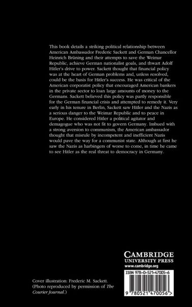 This book details a striking political relationship between American Ambassador Frederic Sackett and German Chancellor Heinrich Brüning and their attempts to save the Weimar Republic, achieve German nationalist goals, and thwart Adolf Hitler's drive to power. Sackett believed that financial policy was at the heart of German problems and, unless resolved, could be the basis for Hitler's success. Very early in his tenure in Berlin, Sackett saw Hitler and the Nazis as a serious danger to the Weimar Republic and to peace in Europe. The American thought that misrule by incompetent and inefficient Nazis would pave the way for a communist state. Although at first he saw the Nazis as harbingers of worse to come, in time he came to see Hitler as the real threat to democracy in Germany.