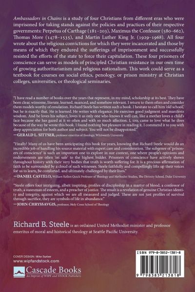 Ambassadors in Chains is a study of four Christians from different eras who were imprisoned for taking stands against the policies and practices of their respective governments: Perpetua of Carthage (181–203), Maximus the Confessor (580–662), Thomas More (1478–1535), and Martin Luther King Jr. (1929–1968). All four wrote about the religious convictions for which they were incarcerated and those by means of which they endured the sufferings of imprisonment and successfully resisted the efforts of the state to force their capitulation. These four prisoners of conscience can serve as models of principled Christian resistance in our own time of growing authoritarianism and religious nationalism. This work could serve as a textbook for courses on social ethics, penology, or prison ministry at Christian colleges, universities, or theological seminaries.