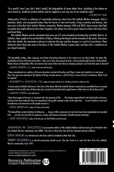 In a world I won't see, but I wish I would, the biographies of some others here, including a few whom we serve lunch to, would be written and be read as eagerly as you say one of me would be read. --Dorothy Day Ambassadors of God is a collection of remarkable obituaries taken from The Catholic Worker newspaper. Rich in anecdote, detail, and unexpected humor, they tell stories of men and women, living in poverty and distress, who were part of the New York Catholic Worker community. Written between 1936 and 2012, these essays shed light on people who might otherwise have been forgotten, but whose lives had a great impact on those who knew them and loved them. The Catholic Worker and the movement that grew out of it were founded by Dorothy Day and Peter Maurin. As Catholics, they sought to live out the Works of Mercy, following the Gospel and the example of the saints. Even years after their deaths, the movement continues to welcome the poor and the stranger in a spirit of nonviolence. These obituaries honor those who came to the doors of The Catholic Worker in great need, and they offer a meditation on our shared humanity. ""The beautifully written, often inspiring, and always fascinating obituaries in this volume are not about death, but about life, specifically, the lives of the men and women--holy, not so holy, and trying to be holy--who passed through the doors of the Catholic Worker Houses of Hospitality. Why not come to know some of the saints who are already praying for you from their posts in heaven?"" --James Martin, SJ, author of My Life with the Saints ""A most unusual and beautiful book! Those remembered are a gallery of diverse characters touched with pathos and illness, humor and creativity, sin and grace. The writing lifts each one up with rich concreteness. Their lives give new meaning to the dignity of being a human person, a child of God, in every kind of circumstance. Read it and be inspired."" --Elizabeth A. Johnson, CSJ, author of Creation and the Cross: The Mercy of God for a Planet in Peril ""A classic piece of Catholic literature is The Lives of the Saints. What the Catholic Worker community has assembled here is an equal testament to the saintly lives of those who have crossed its threshold and brought heaven a little closer to this broken world."" --Martin Sheen, actor and activist ""Open these pages to discover, or reconnect with, the meaning of life. It is not what we accomplish or amass. It is not our great works. It is who loves us, who grieves our deaths, who keeps saying our names. The people memorialized in this book built no fortunes but they lived, they mattered, they are remembered. This gentle reminder comes at the right time; amid the casual brutality and callous disregard that marks this epoch, we are invited to a new level of tenderness and awareness to the people around us."" --Frida Berrigan, author of It Runs in the Family ""Ambassadors of God is the story of the heart of the Catholic Worker. This beautifully curated collection of obituaries gives us what no historical or theological study can do--it brings to life a community of souls who have lived complicated and wounded lives, often battling alcoholism or mental illness or both, yet who are also full of a generous, strong, and luminous humanity, valuable beyond reckoning."" --Kate Hennessy, author of Dorothy Day: The World Will Be Saved By Beauty Dan Mauk is a retired nurse who lives with his husband in New York City. Amanda W. Daloisio is an associate editor of The Catholic Worker and has been part of the New York City Catholic Worker community since 2002. She lives in New York City with her husband and two children. Terry Rogers is a retired community health nurse. She has lived in or near the New York City Catholic Worker community since 1971.