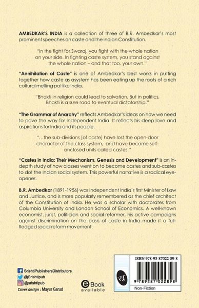 AMBEDKAR'S INDIA is a collection of three of B.R. Ambedkar's most prominent speeches on caste and the Indian Constitution. "In the fight for Swaraj, you fight with the whole tion on your side. In fighting caste system, you stand against the whole tion - and that too, your own." "Annihilation of Caste" is one of Ambedkar's best works in putting together how caste as a system has been eating up the roots of a rich cultural melting pot like India. "Bhakti in religion could lead to salvation. But in politics, Bhakti is a sure road to eventual dictatorship." "The Grammar of Archy" reflects Ambedkar's ideas on how we need to pave the way for Independent India. It reflects his deep love and aspirations for India and its people. "...the sub-divisions [of caste] have lost the open-door character of the class system, and have become self-enclosed units called castes." "Castes in India: Their Mechanism, Genesis and Development" is an in-depth study of how classes went on to become castes and sub-castes to dot the Indian social system. This powerful rrative is a radical eye-opener.