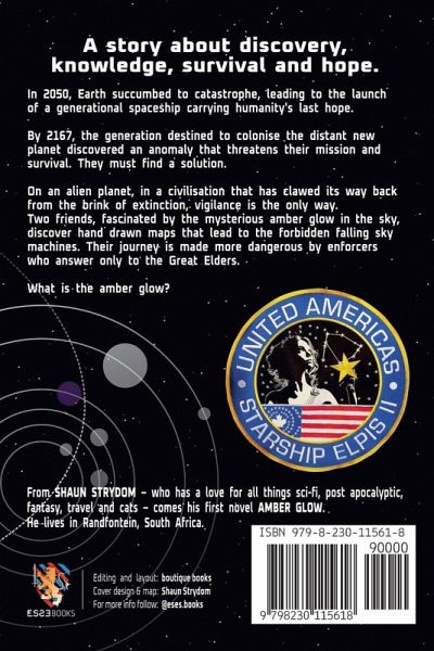 The tale unfolds on an alien planet, where a mysterious amber glow illuminates the sky. Two lifelong friends, driven by curiosity, decide to investigate the enigmatic objects they call "falling sky machines." Their society, governed by strict rules and haunted by the memory of a near-extinction event years ago, lives in constant caution. Armed only with hand-drawn maps to the nearest forbidden object, they embark on their perilous journey. Meanwhile, a group on an interstellar mission from a doomed Earth confronts the harsh realities of life aboard a generational spaceship. To ensure the survival of their species, people are born only every ten years, with the hope of reaching a distant planet eighteen light years away from humanity's birthplace. This group is destined to be the chosen generation to arrive and colonize the new world that might support life-if they can overcome the anomaly that threatens to make their journey near impossible. The novel alternates chapters between the two protagonists, exploring their lives as they uncover the mysteries of their world, the stars, and their species. Back of book blurb: Amber Glow is a story about discovery, knowledge, survival, and hope. In 2050, Earth succumbed to catastrophe, leading to the launch of a generational spaceship carrying humanity's last hope. By 2167, the generation destined to colonize the distant new planet discovered an anomaly that threatens their mission and survival. They must find a solution. The story begins on an alien planet, in a civilization that has clawed its way back from the brink of extinction; vigilance is the only way. Two friends, fascinated by the mysterious amber glow in the sky, discover hand-drawn maps that lead to the forbidden falling sky machines. Their journey is made more dangerous by enforcers who answer only to the Great Elders. What is the amber glow?