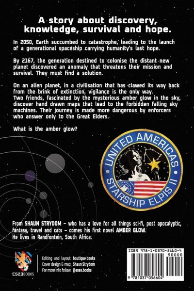 Amber Glow is a story about discovery, knowledge, survival and hope. In 2050, Earth succumbed to catastrophe, leading to the launch of a generational spaceship carrying humanity's last hope. By 2167, the generation destined to colonise the distant new planet discovered an anomaly that threatens their mission and survival. They must find a solution. On an alien planet, in a civilisation that has clawed its way back from the brink of extinction, vigilance is the only way. Two friends, fascinated by the mysterious amber glow in the sky, discover hand drawn maps that lead to the forbidden falling sky machines. Their journey is made more dangerous by enforcers who answer only to the Great Elders. What is the amber glow?