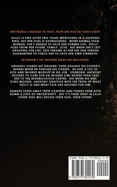 Her world crashed to halt, now she has to take flight.Holly is free after two years imprisoned in a fighting ring, but her soul is extinguished. More animal than woman, she's unable to face her former life. Holly flees from her future, family, love. But when she's left grasping for life, Fate throws at her the one person guaranteed to force her to face her own strength. He doesn't let anyone make his decisions.Anthony stands his ground, even against his father's wishes when he pursued his career. He sees a lot of sick and injured wildlife in his job. Stubborn, Anthony decides to care for an injured owl rather than take her to the rehabilitation centre. But when his owl goes missing, Anthony grapples with the truth of what Holly is and what Fate has decided for him.Danger takes away their control and pushes them both down a path of uncertainty. But it's their trust in each other that will decide their fate, their future.