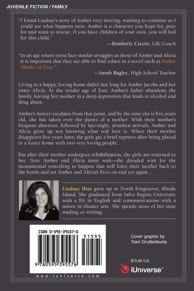 "I found Lindsay's story of Amber very moving, wanting to continue so I could see what happens next. Amber is a character you hope for, pray for and want to rescue. If you have children of your own, you will feel for this child."-Kimberly Cicetti, Life Coach "In an age where teens face similar struggles as those of Amber and Alicia it is important that they are able to find solace in a novel such as Amber Shades of Grey.-Sarah Bagley, High School Teacher Living in a happy, loving home didn't last long for Amber Jacobs and her sister Alicia. At the tender age of four, Amber's father abandons the family, leaving her mother in a deep depression that leads to alcohol and drug abuse. Amber's misery escalates from that point, and by the time she is five years old, she has taken over the duties of a mother. With their mother's frequent absences, followed by late-night, drunken arrivals, Amber and Alicia grow up not knowing what real love is. When their mother disappears five years later, the girls get a brief reprieve after being placed in a foster home with two very loving people. But after their mother undergoes rehabilitation, the girls are returned to her. Now Amber and Alicia must wait-the dreaded wait for the monumental something to happen that will force their mother back to the bottle and set Amber and Alicia's lives on end yet again .