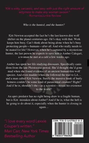 He's been a lone wolf for centuries, the last of his species. A secret. And then she enters his life. But is she the future he'd never imagined he could have...or is she his worst nightmare? Who is the hunted, and the hunter? Kitt Newton accepted the fact he's the last known dire wolf shifter on the planet centuries ago. He's okay with that. Work keeps him busy. Can't think about being alone when he's busy protecting people-humans-after all. And who really needs to be mated for life? However, when he's captured by a mysterious hunter, the last person he expects to save him is Amber Calegari, a woman he met at a café a few weeks ago. Amber has spent her life studying dinosaurs. Specifically canis dirus from the late Pleistocene period. She'd thought she'd gone mad when she found evidence of an ancient human/dire wolf species. And even madder when she followed the trail to LA...and a man called Kitt Newton. Surely the massive hunk of burly hotness couldn't be some kind of paranormal creature? Right? And if he is, shouldn't she-as a scientist-reveal his existence to the world? An apex predator has no right being draw to a fragile human, but is Kitt mistaken about Amber? And if he is, what the hell is he going to do about it, especially when the hunter is closing in again...