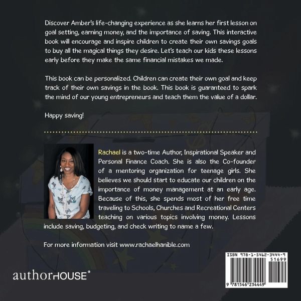 Discover Ambers life-changing experience as she learns her first lesson on goal setting, earning money, and the importance of saving. This interactive book will encourage and inspire children to create their own savings goals to buy all the magical things they desire. Lets teach our kids these lessons early before they make the same financial mistakes we made. This book can be personalized. Children can create their own goal and keep track of their own savings in the book. This book is guaranteed to spark the mind of our young entrepreneurs and teach them the value of a dollar. Happy saving!