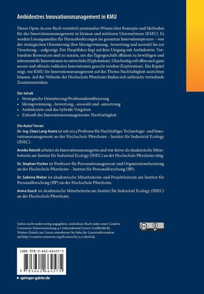 Dr.-Ing. Claus Lang-Koetz arbeitete nach seinem Studium (Dipl.-Ing. Umweltschutztechnik) lang in der angewandten Forschung an der Universität Stuttgart (Promotion zum Dr.-Ing.) und am Fraunhofer-Institut für Arbeitswirtschaft und Organisation IAO in Stuttgart. Danach leitete er das Innovationsmanagement bei einem international agierenden Anlagenbauunternehmen. Seit 2014 ist er Professor für Nachhaltiges Technologie- und Innovationsmanagement an der Hochschule Pforzheim und seit 2021 stellvertretender Leiter des Instituts für Industrial Ecology (INEC). In angewandten Forschungsprojekten beschäftigt er sich damit, wie technisch basierte Innovationen erfolgreich umgesetzt und dabei Nachhaltigkeitsaspekte berücksichtigt werden können. Zusammen mit Stephan Fischer leitete er das Forschungsprojekt InnoDiZ. Annika Reischl war nach ihrem Studium des Ressourceneffizienzmanagements und Innovationsmanagements als akademische Mitarbeiterin am Institut für Industrial Ecology der Hochschule Pforzheim tätig. Hier befasste sie sich mit den Themen Innovationsmanagement in KMU und Nachhaltigkeit im Innovationsmanagement. Sie war an der Entwicklung eines Tools zur Bewertung von innovativen Ideen hinsichtlich deren Umweltaspekte beteiligt. Im Forschungsprojekt InnoDiZ befasste sie sich hauptsächlich mit der Entwicklung und Durchführung einer Blended-Learning-Weiterbildung für KMU. Sie ist nun als Innovationsmanagerin in einem Unternehmen tätig. Dr. Stephan Fischer ist Professor für Personalmanagement und Organisationsberatung an der Hochschule Pforzheim. Dort lehrt er im Bachelor BWL/Personalmanagement und im Master "Human Resources Management" und forscht als Direktor des Instituts für Personalforschung. Praktische Erfahrungen sammelte er in leitender Funktion in den Bereichen Personal und Beratung. Als wissenschaftlicher Beirat unterstützt er mehrere Unternehmen. Daneben ist er Mitglied in der Jury des HR Innovation Awards der Messe Zukunft Personal. Seine Forschungsschwerpunkte liegen in den Themenbereichen der agilen Transformation sowie in der Frage der Nachhaltigkeit im HRM. Zudem wurde er 2017 und 2019 vom Haufe Verlag zu den 40 führenden Köpfen (Kategorie Wissenschaftler) im HR gewählt. Zusammen mit Claus Lang-Koetz leitete er das Forschungsprojekt InnoDiZ. Dr. Sabrina Weber ist akademische Mitarbeiterin und Projektleiterin am Institut für Personalforschung (IfP) an der Hochschule Pforzheim und lehrt im Master "Human Resources Management" und im Bachelor BWL/Personalmanagement. In angewandten Forschungsprojekten gilt ihr Interesse insbesondere dem Wandel der Arbeitswelt, Agilität in Organisationen, Nachhaltigkeit im Personalmanagement sowie Mitbestimmung. Zuvor war sie akademische Mitarbeiterin an der Hochschule Furtwangen im Forschungsschwerpunkt Innovationsforschung und Genderforschung, wo sie sich mit Karriereverläufen in Forschung und Entwicklung in der Privatwirtschaft beschäftigte. Im Forschungsprojekt InnoDiZ war sie insbesondere an der Konzeption und didaktischen Umsetzung und Weiterentwicklung einer Blended-Learning-Weiterbildung für KMU beteiligt. Anina Kusch arbeitet nach dem Studium im Bereich Ressourceneffizienzmanagement sowie Life Cycle and Sustainability als akademische Mitarbeiterin am Institut für Industrial Ecology der Hochschule Pforzheim. Innerhalb des Studiums setzte sie sich mit dem nachhaltigen Wirtschaften, der Prozessoptimierung mittels Lean Management sowie ökobilanziellen Bewertungen intensiv auseinander. Ihre Schwerpunkte liegen nun im Bereich des nachhaltigen Technologie- und Innovationsmanagements, der Beschleunigung von Umweltinnovationen durch die gezielte Vernetzung von grünen Start-ups mit dem Mittelstand sowie kreislaufwirtschaftlichen Fragestellungen. Kapitel 7 des Buchs wurde von den obenstehenden Autorinnen und Autoren zusammen mit Philipp Preiss geschrieben: Dr.-Ing. Philipp Preiss entwickelte nach seinem Studium der Umweltschutztechnik Methoden zur