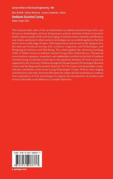 This book provides state-of-the-art information on ambient assisted living (AAL), and focuses on technologies, services, living spaces, policies, and interventions to promote health, improve quality of life, and active aging. It includes various research contributions, case studies, and projects where assistive technologies are successfully applied in the field, and it covers a wide range of topics: Tailoring products and services to the Aging society, Bio-data and Artificial sensing AAL scenarios, Cognition, and Technologies, and Designing for Inclusion and Well-Being. The volume gathers the refereed proceedings of the 11th Italian Forum on Ambient Assisted Living (AAL), ForItAAL2020. This annual event involves companies, researchers, and stakeholders involved in the field of Ambient Assisted Living, it took place online due to the pandemic situation of Covid-19, and was organized by the University of Padua through the Human Inspired Technologies Research Centre and theRegional Innovative Network "ICT for Smart and Sustainable Living" with the contribution of the Smart Living Technologies' Cluster. With its wide-ranging contributions to the topic, the book will inspire the readers and the researchers to continue their exploration of AAL technologies to support the development of products and services that make a real difference in people's daily lives.