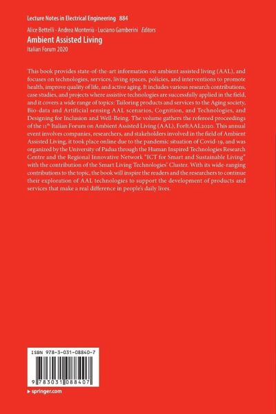 This book provides state-of-the-art information on ambient assisted living (AAL), and focuses on technologies, services, living spaces, policies, and interventions to promote health, improve quality of life, and active aging. It includes various research contributions, case studies, and projects where assistive technologies are successfully applied in the field, and it covers a wide range of topics: Tailoring products and services to the Aging society, Bio-data and Artificial sensing AAL scenarios, Cognition, and Technologies, and Designing for Inclusion and Well-Being. The volume gathers the refereed proceedings of the 11th Italian Forum on Ambient Assisted Living (AAL), ForItAAL2020. This annual event involves companies, researchers, and stakeholders involved in the field of Ambient Assisted Living, it took place online due to the pandemic situation of Covid-19, and was organized by the University of Padua through the Human Inspired Technologies Research Centre and theRegional Innovative Network "ICT for Smart and Sustainable Living" with the contribution of the Smart Living Technologies' Cluster. With its wide-ranging contributions to the topic, the book will inspire the readers and the researchers to continue their exploration of AAL technologies to support the development of products and services that make a real difference in people's daily lives.