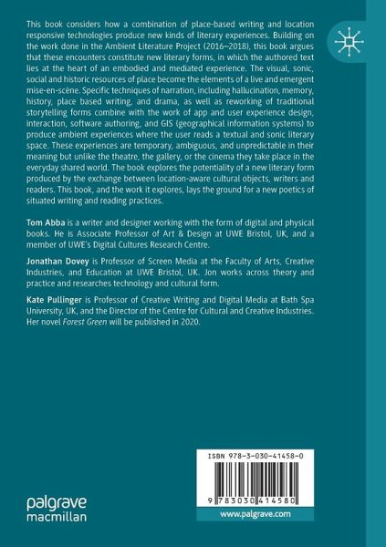 This book considers how a combination of place-based writing and location responsive technologies produce new kinds of literary experiences. Building on the work done in the Ambient Literature Project (2016-2018), this books argues that these encounters constitute new literary forms, in which the authored text lies at the heart of an embodied and mediated experience. The visual, sonic, social and historic resources of place become the elements of a live and emergent mise-en-scène. Specific techniques of narration, including hallucination, memory, history, place based writing, and drama, as well as reworking of traditional storytelling forms combine with the work of app and user experience design, interaction, software authoring, and GIS (geographical information systems) to produce ambient experiences where the user reads a textual and sonic literary space. These experiences are temporary, ambiguous, and unpredictable in their meaning but unlike the theatre, the gallery, or the cinema they take place in the everyday shared world. The book explores the potentiality of a new literary form produced by the exchange between location-aware cultural objects, writers and readers. This book, and the work it explores, lays the ground for a new poetics of situated writing and reading practices.