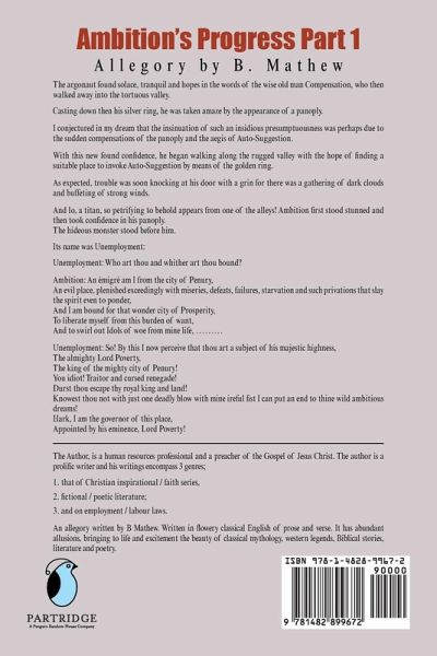 Short Description An allegory written by B Mathew. Written in flowery classical English of prose and verse. It has abundant allusions, bringing to life and excitement the beauty of classical mythology, western legends, Biblical stories, literature and poetry. Extended Description This book is a fiction story. But this book is also poetry. And this book is also a philosophy on principles of success. You can read it like a novel or fairytale story. You can also read it like poetry or philosophy. This allegory is written in classical English language with verses in poetry and allusions. The plot of this fairytale allegory is about a vagabond called Mr. Ambition, who lives in the City of Penury. This city of Penury is ruled by a horrible monster called Lord Poverty. In this city of Penury, this vagabond suffers great disgrace & reproach. One day, a good man by the name of Mr. Think Rich meets Mr. Ambition and encourages him to run away from the city of Penury and escape to another city called the City of Prosperity. But however, the long journey to that City of Prosperity is filled with great and terrible dangers and deadly snares, where there are many giants, monsters and demons and unimaginable deadly traps. As such, advises Mr. Think Rich, that Mr. Ambition must first make a detour to a mystical labyrinth called the Garden of Sorrow to seek out a mysterious giant called Mr. Other-Self. Because only Mr. Other-Self could safely guide Mr. Ambition to the city of Prosperity. At the entrance of the mystical Garden of Sorrow, Mr. Ambition meets Mr. Destiny. Mr. Destiny thereafter knights him as Sir Ambition the gallant Argonaut. But however, Sir Ambition finds himself overwhelmed by great misfortunes inside the garden of Sorrow. Where following a terrible battle with the horrible giant called Suicide, Sir Ambition is captured by the monster, Unemployment and imprisoned in a labour camp called, Hard-Manual-Labour Estate. Here the monster Unemployment maims Sir Ambition by digging out one of his eyes. But with the aid of an alter-ego, Sir Auto-Suggestion, Sir Ambition escapes Hard-Manual-Labour estate, but with Unemployment on hot pursued. In Sir Ambition's search for the mysterious man, Other-Self, he accidently stumbles upon a mysterious kingdom called, the Kingdom of Within. Here he is welcomed and nursed. After his wounds are healed, the king of this Kingdom of Within and his valiant gladiators escort Ambition out in his search for the elusive Mr. Other-Self. Then once again, the grisly monster, Unemployment confronts Ambition, the valiant king and knights from the kingdom of Within. But the monster, Unemployment easily overpowers and destroys these valiant men and fatally wounds Ambition, leaving him to die a painful and slow death. But with the help of his alter-ego and others, Ambition gathers his feeble strength and continue searching for the mysterious man, Mr. Other-Self. Finally Ambition stumbles upon a strange glittering Kingdom of GreatWithin and makes a last and final attempt to awaken the mysterious man, Other-Self. Sir Ambition succeeds in setting into motion the awakening process but soon dies from his fatal wounds. But even though Ambition dies, he dies with anticipated hope of a resurrection from death, knowing that Mr. Other-Self shall raise him up. Part 1 ends with the awakening process of the invincible man Other-Self.