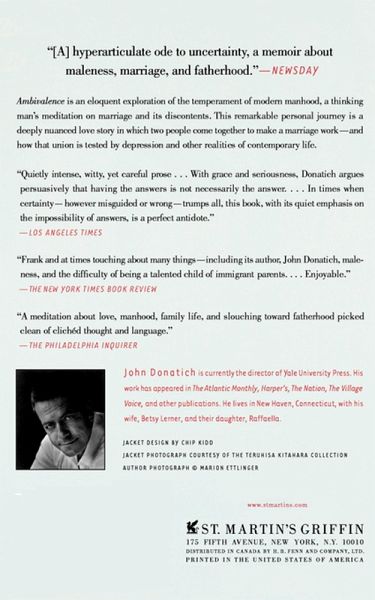 Ambivalence, a Love Story is a deeply nuanced accounting in which two people come together to make a marriage work. Rarely has marriage and its compromises been so intimately portrayed, especially when tested by depression, unemployment, miscarriage and other realities of contemporary life. Whether inside the sterile out-placement offices for reengineered executives or traipsing through the suburban homes and competing lifestyles with perky realtors, Donatich muses on life's transitions with rare candor and insight. Ambivalence traces the inner life of a man coming into adulthood: on being first generation, on interfaith marriage, on playing the accordion and ultimately on the question of whether we are better off solitary or coupled. But at heart, it is a tender -- if circumspect -- love story. An astonishing middle-aged debut.