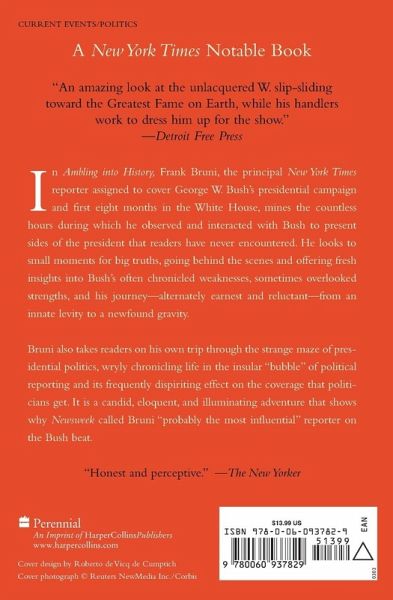 The unlikely Odyssey of George W. Bush. As the principal New York Times reporter assigned to cover George W. Bush's presidential campaign from its earliest stages - and then as a White House correspondent - Frank Bruni has spent as much time around Bush over the last two years as any other reporter. In Ambling Into History, Bruni paints the most thorough, balanced, eloquent and lively portrait yet of a man in many ways ill-suited to the office he sought and won, focusing on small moments that often escaped the news media's notice. From the author's initial introduction to Bush through a nutty election night and Bush's first months in office, Bruni captures the president's familiar and less familiar oddities and takes readers on an often funny, usually irreverent, journey into the strange, closed universe - or bubble - of campaign life. The result is an original take on the political process and a detailed study of George W. Bush as most people have never seen him.