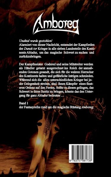 Unaktal wurde gestohlen!Alarmiert von dieser Nachricht, entsendet der Kampforden der Dunak tor Krieger in alle sieben Landesteile des Kontinents Abladur, um das magische Schwert zu suchen und zurückzubringen.Der Kampfmeister Godered und seine Mitstreiter werden als Händler getarnt ausgerechnet ins Reich der anmaßenden Gotonen gesandt, die sich für die wahren Herrscher des Kontinents halten und gefährliche Intrigen schmieden. Während sich die allzu unterschiedlichen Krieger bei jeder Gelegenheit streiten, sind ihnen Kämpfer eines finsteren Ordens auf den Fersen. Sollte es diesen gelingen, das Schwert in ihren Besitz zu bringen, könnte das den Untergang für ganz Abladur bedeuten.Band 1 der Fantasyreihe rund um die magische Rüstung Amboreg.