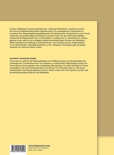 In dieser elfbändigen Gesamttranskription des 'Ambraser Heldenbuchs' erscheinen erstmals alle Texte im frühneuhochdeutschen Originalwortlaut. Die zeichengetreue Transkription ist synoptisch dem Manuskriptbild gegenübergestellt. Die diplomatische Transkription ist nach Versen umbrochen, die gemäß etablierten Editionen nummeriert sind. Die fast 250 Pergamentblätter umfassende Prunkhandschrift, die von Maximilian I. zu Beginn des 16. Jahrhunderts in Auftrag gegeben wurde, zählt zu den wichtigsten Quellen deutschsprachiger Literatur des Mittelalters. Band 4 beinhaltet das Heldenepos 'Dietrichs Flucht', das zusammen mit der 'Rabenschlacht' in vier Handschriften vollständig überliefert ist. Die vorliegende Transkription gibt die jüngste Abschrift von 'Dietrichs Flucht' wieder.