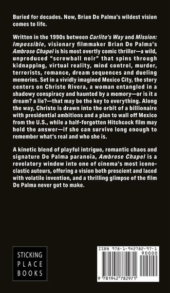 Buried for decades. Now, Brian De Palma's wildest vision comes to life. Written in the 1990s between Carlito's Way and Mission: Impossible, visionary filmmaker Brian De Palma's Ambrose Chapel is his most overtly comic thriller-a wild, unproduced "screwball noir" that spins through kidnapping, virtual reality, mind control, murder, terrorists, romance, dream sequences and dueling memories. Set in a vividly imagined Mexico City, the story centers on Christe Rivera, a woman entangled in a shadowy conspiracy and haunted by a memory-or is it a dream? a lie?-that may be the key to everything. Along the way, Christe is drawn into the orbit of a billionaire with presidential ambitions and a plan to wall off Mexico from the U.S., while a half-forgotten Hitchcock film may hold the answer-if she can survive long enough to remember what's real and who she is. A kinetic blend of playful intrigue, romantic chaos and signature De Palma paranoia, Ambrose Chapel is a revelatory window into one of cinema's most iconoclastic auteurs, offering a vision both prescient and laced with volatile invention, and a thrilling glimpse of the film De Palma never got to make.