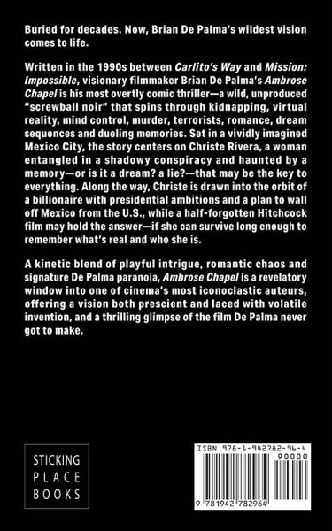 Buried for decades. Now, Brian De Palma's wildest vision comes to life. Written in the 1990s between Carlito's Way and Mission: Impossible, visionary filmmaker Brian De Palma's Ambrose Chapel is his most overtly comic thriller-a wild, unproduced "screwball noir" that spins through kidnapping, virtual reality, mind control, murder, terrorists, romance, dream sequences and dueling memories. Set in a vividly imagined Mexico City, the story centers on Christe Rivera, a woman entangled in a shadowy conspiracy and haunted by a memory-or is it a dream? a lie?-that may be the key to everything. Along the way, Christe is drawn into the orbit of a billionaire with presidential ambitions and a plan to wall off Mexico from the U.S., while a half-forgotten Hitchcock film may hold the answer-if she can survive long enough to remember what's real and who she is. A kinetic blend of playful intrigue, romantic chaos and signature De Palma paranoia, Ambrose Chapel is a revelatory window into one of cinema's most iconoclastic auteurs, offering a vision both prescient and laced with volatile invention, and a thrilling glimpse of the film De Palma never got to make.