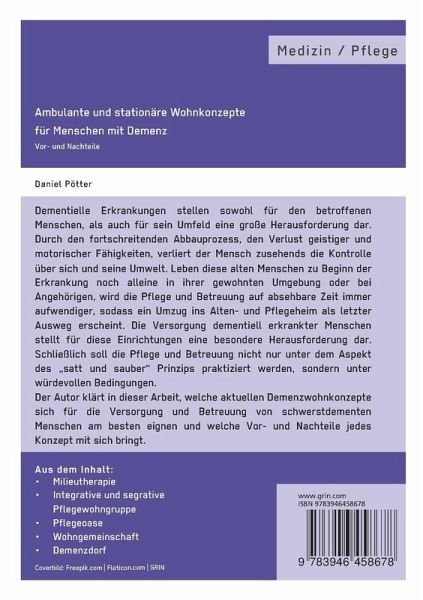 Diese Arbeit beschäftigt sich mit folgenden Fragen:- Welche ambulanten & stationären Wohnkonzepte eignen sich für die Versorgung von Menschen mit einer fortgeschrittenen Demenz?- Welche Implikationen oder Konsequenzen hat das für die Pflege im Demenzbereich? - Werden die pflegerischen Anforderungen in den Demenzwohnkonzepten erfüllt?Dementielle Erkrankungen stellen sowohl für den betroffenenMenschen, als auch für sein Umfeld eine große Herausforderung dar. Durch den fortschreitenden Abbauprozess, den Verlust geistiger und motorischer Fähigkeiten, verliert der Mensch zusehends die Kontrolle über sich und seine Umwelt. Leben diese alten Menschen zu Beginn der Erkrankung noch alleine in ihrer gewohnten Umgebung oder bei Angehörigen, wird die Pflege und Betreuung auf absehbare Zeit immer aufwendiger, sodass ein Umzug ins Alten- und Pflegeheim als letzter Ausweg erscheint. Die Versorgung dementiell erkrankter Menschen stellt für diese Einrichtungen eine besondere Herausforderung dar. Schließlich soll die Pflege und Betreuung nicht nur unter dem Aspekt des "satt und sauber" Prinzips praktiziert werden, sondern unterwürdevollen Bedingungen.Der Autor klärt in dieser Arbeit, welche aktuellen Demenzwohnkonzepte sich für die Versorgung und Betreuung von schwerstdementen Menschen am besten eignen und welche Vor- und Nachteile jedes Konzept mit sich bringt.Aus dem Inhalt:- Milieutherapie- Integrative und segrative Pflegewohngruppe- Pflegeoase- Wohngemeinschaft- Demenzdorf