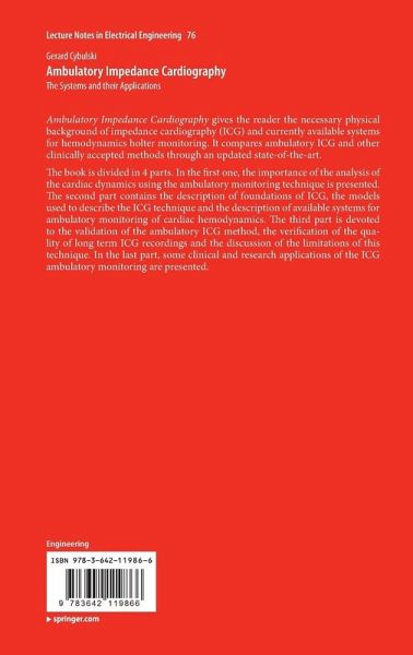 The book is divided in 4 parts. In the first one, the importance of the analysis of the cardiac dynamics using the ambulatory monitoring technique is presented. The second part contains the description of foundations of impedance cardiography (ICG), the models used to describe the ICG technique and the description of available systems for ambulatory monitoring of cardiac hemodynamics. The third part is devoted to the validation of the ambulatory ICG method, the verification of the quality of long term ICG recordings and the discussion of the limitations of this technique. In the last part, some clinical and research applications of the ICG ambulatory monitoring are presented. The simultaneous recordings of electrocardiogram (ECG) and ICG in the transient cardiac arrhythmia events illustrate the potential applications of that method for quantitative analysis of hemodynamics when the implementation of the stationary methods would be either difficult or not possible to do. The book is followed by references, alphabetical index and appendices containing the technical data of the available systems for portable monitoring of cardiac hemodynamics.
